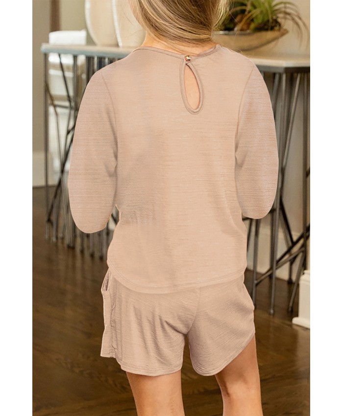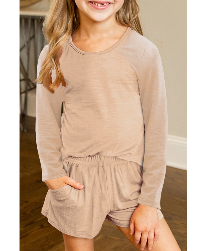 This two-piece set includes a long sleeve pullover and pocketed shorts