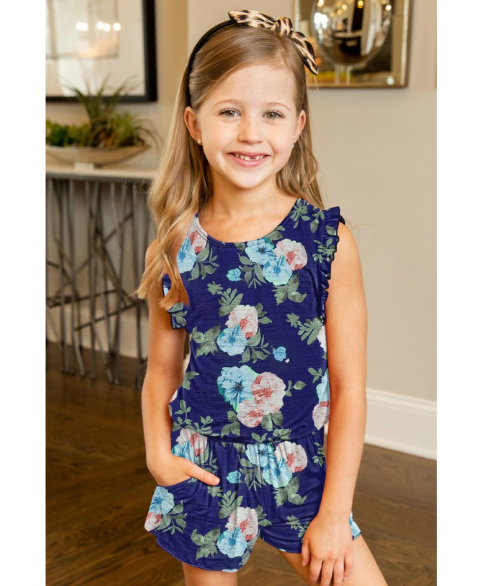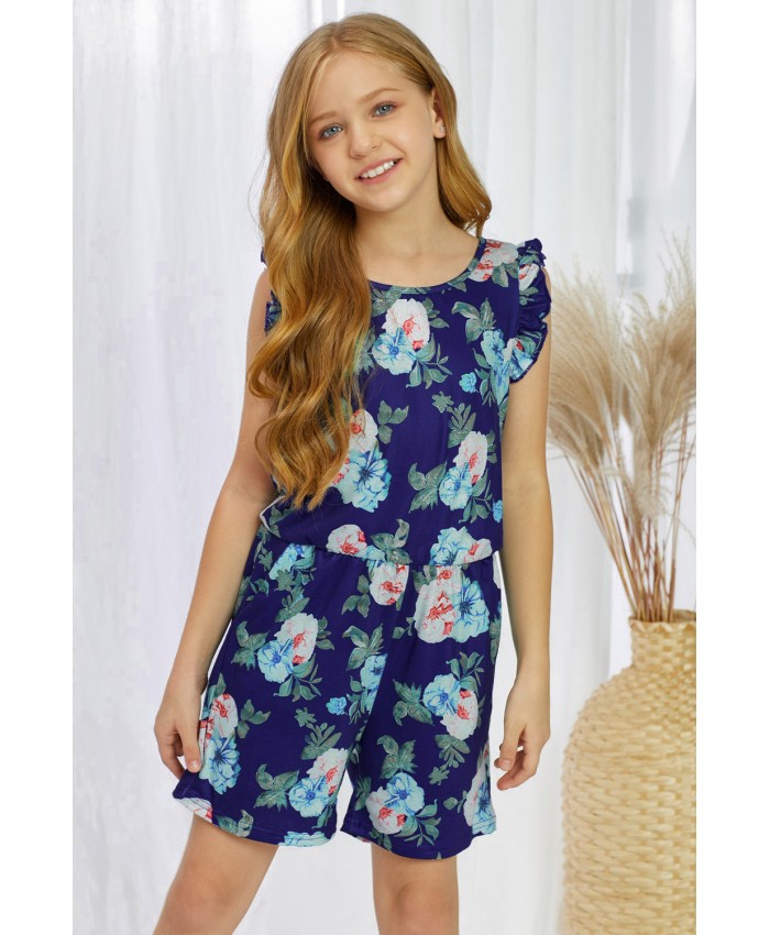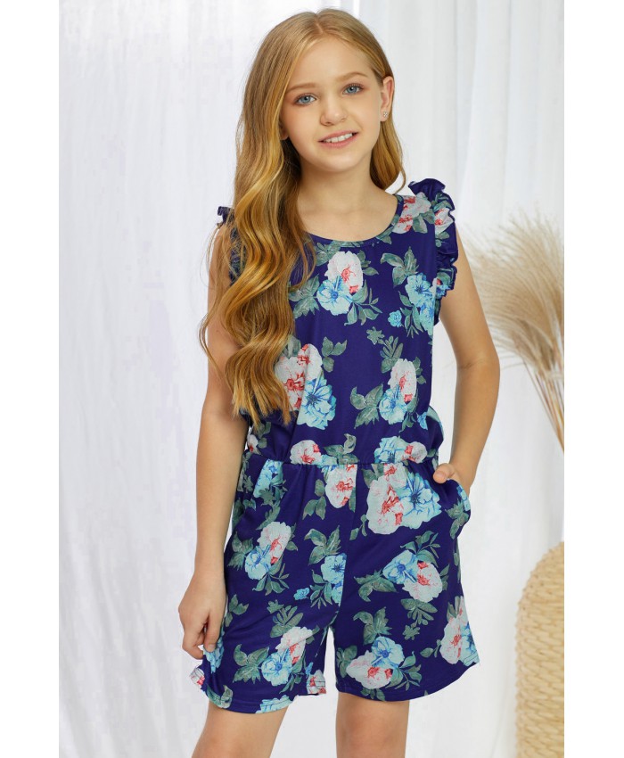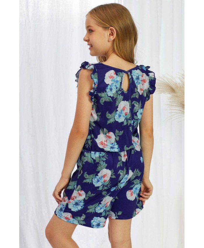 Blue Floral Print Ruffled Sleeveless Girls Romper