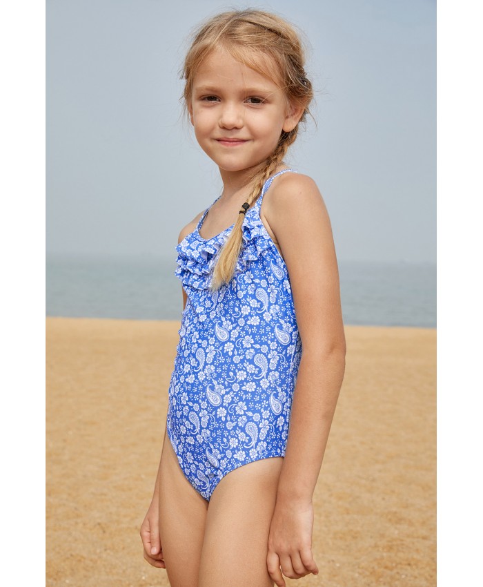 Blue White Paisley Print Little Girl Maillot with Ruffle