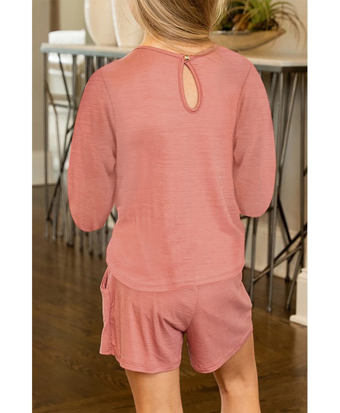 This two-piece set includes a long sleeve pullover and pocketed shorts